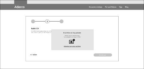 The user is asked to upload a CV after filling in a form with personal information, but if the file weights more than 5MB, not only the user can't upload the file, but also they don't get a second chance at uploading said file.
